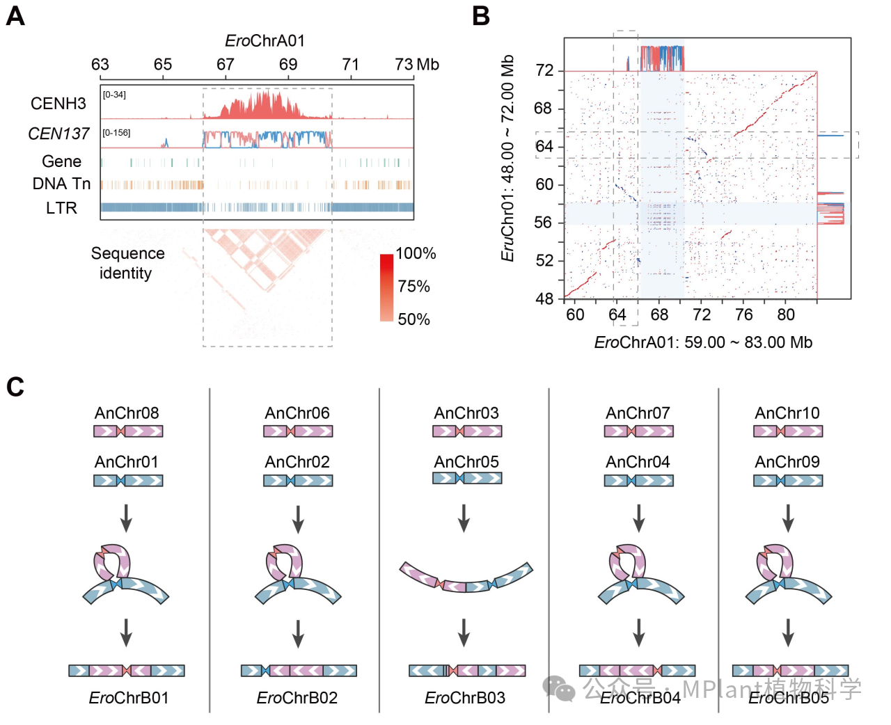 本研究通过CENH3抗体染色质免疫共沉淀结合二代测序的方法(ChIP-seq),首次定位了蔗茅和滇蔗茅的功能着丝粒位置(图3A)。蔗茅属和甘蔗属的着丝粒主要由CEN137组成,不同种间存在序列分化。滇蔗茅的A亚基因组与蔗茅高度相似,但是着丝粒变异较为明显(图3B)。着丝粒区域存在大量的结构变异,尤其是倒位。结合CEN137的正向反向交替分布特征,推测倒位作为着丝粒快速进化的驱动力。作者对同源染色体的CEN137进行系统发育树的分析,结合基因组共线性,模拟出B亚基因组染色体的形成过程:ChrB03染色体由两条祖先染色个通过端对端融合(End-to-end chromosome fusions,EEFs)形成,其余四条染色体均由嵌套式融合(nested chromosome fusions,NCFs)形成。融合染色体的早期可能存在双着丝粒(dicentricity),但随着时间推移,最终仅一个祖先着丝粒保留了下来(图3C)。