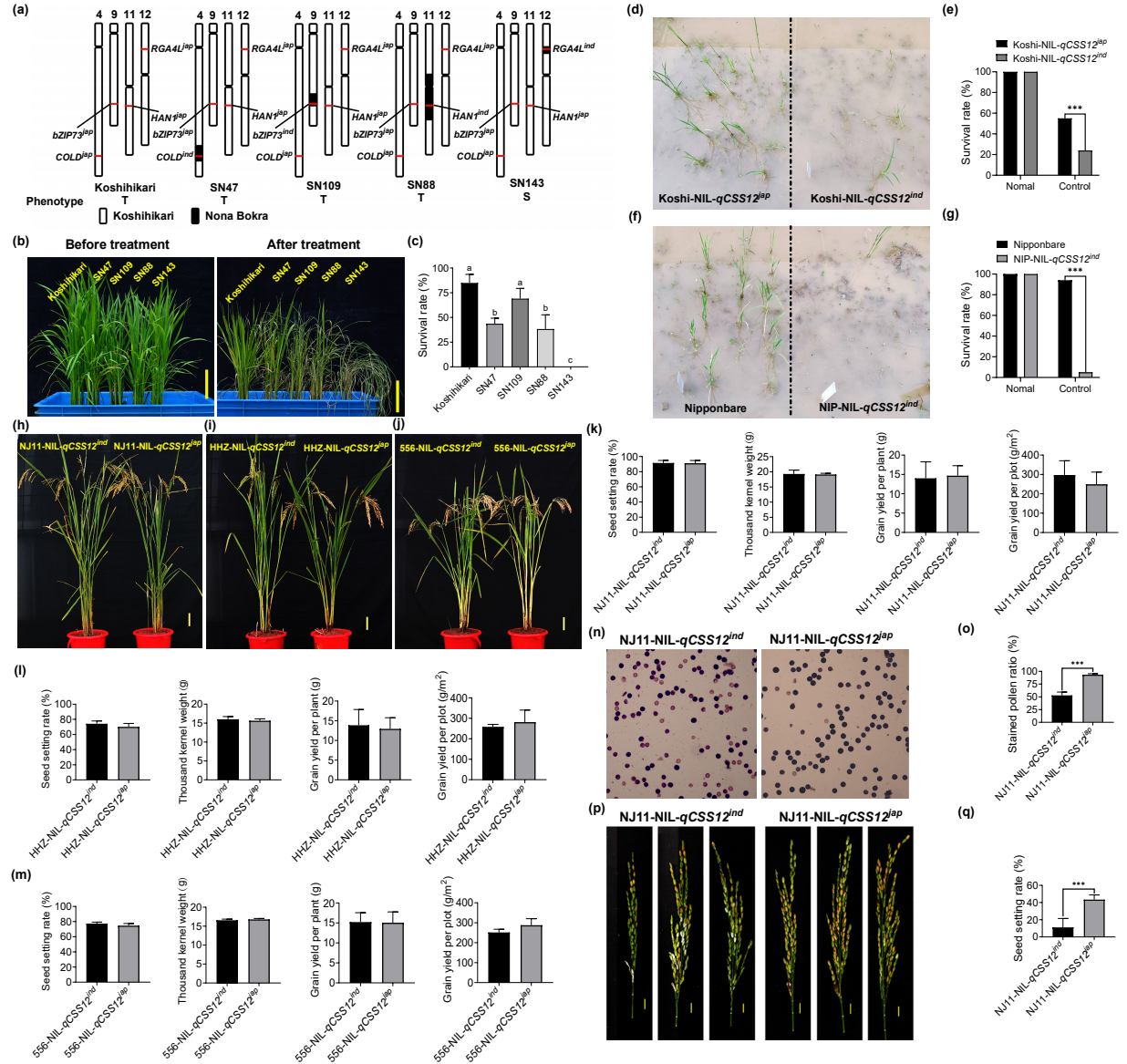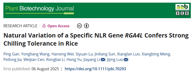 2025年8月6日,太阳集团2007罗继景教授课题组及崖州湾国家实验室李家洋院士团队合作研究论文“Natural variation of a specific NLR gene RGA4L confers strong chilling tolerance in rice”在国际知名杂志Plant Biotechnology Journal在线发表。该研究成功从粳稻品种Koshihikari(越光)克隆了高效应的水稻耐冷性基因Disease Resistance Gene Analog 4-Like(RGA4L),该基因编码一个特异调控非生物胁迫抗性的NLR蛋白,可显著提高水稻苗期、分蘖期和开花期的耐冷性;同时该研究揭示了RGA4L通过与OsHSP90和OsLEA5的相互作用共同调控水稻耐冷。将RGA4Ljap导入不同籼稻品种(NJ11/HHZ/556)时,可以在提高水稻耐冷性的同时对产量不产生不良影响。这一重要发现不仅丰富了水稻耐冷的调控网络,完善了相关理论体系,更为水稻低温抗性育种提供了宝贵的基因资源,对低温胁迫下稳定水稻产量有重要意义。