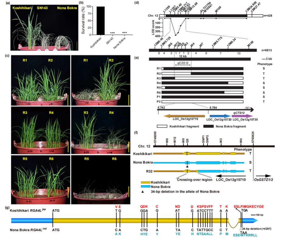 科研团队利用以冷敏感籼稻Nona Bokra为供体,以耐冷的粳稻Koshihikari(越光)为受体回交构建的染色体单片段替换系(中科院上海分子植物科学卓越创新中心林鸿宣院士馈赠)为材料定位克隆了调控水稻耐冷的主效QTL qCSS12。通过对基因的结构进行预测分析,确定该位点的目的基因(命名为RGA4L)编码 CC-NB-LRR 结构域的 NLR蛋白,且籼稻基因型RGA4Lind等位基因在 LRR 结构域处存在 34 bp 的缺失,该缺失是导致Nona Bokra与Koshihikari冷耐受程度不同的关键因素(Fig. 1)。