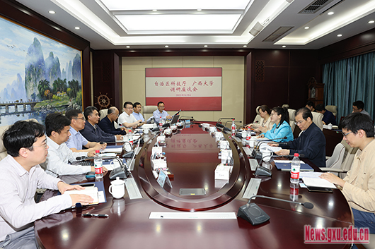 3月18日,自治区科技厅党组成员姚作芳带队到我校调研,研究推进我校国家重点实验室重组、省部共建国家重点实验室申报工作,自治区政协副主席、校党委书记王乃学出席座谈会。副校长韩林海主持会议,副校长冯家勋,亚热带农业生物资源保护与利用国家重点实验室、省部共建特色金属资源与西部陆海新通道工程安全国家重点实验室、科技处等部门负责人参加会议。