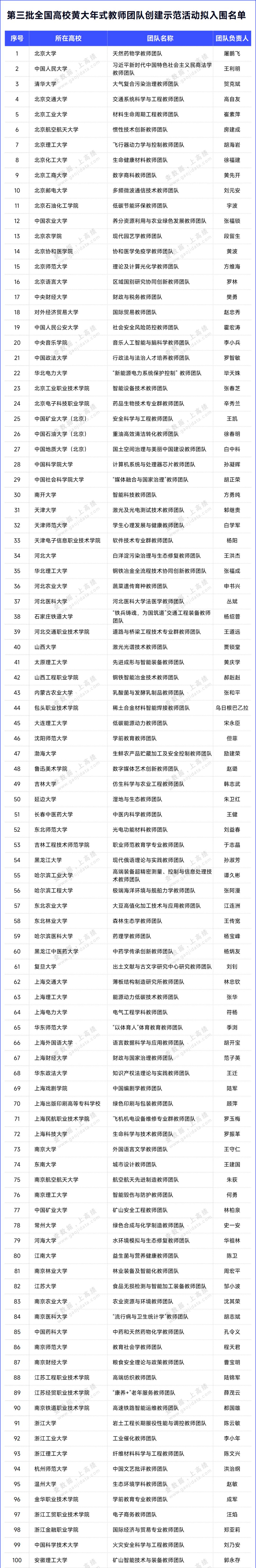 为学习贯彻党的二十大精神,贯彻落实习近平总书记对黄大年同志先进事迹的重要指示和给全国高校黄大年式教师团队代表的重要回信精神,以教师团队建设引导广大教师持续向黄大年同志学习,根据《教育部关于开展全国高校黄大年式教师团队创建活动的通知》(教师函〔2023〕2号),在部委院校申报、省级教育行政部门遴选推荐、专家评审基础上,拟确定第三批“全国高校黄大年式教师团队”,现进行公示。
