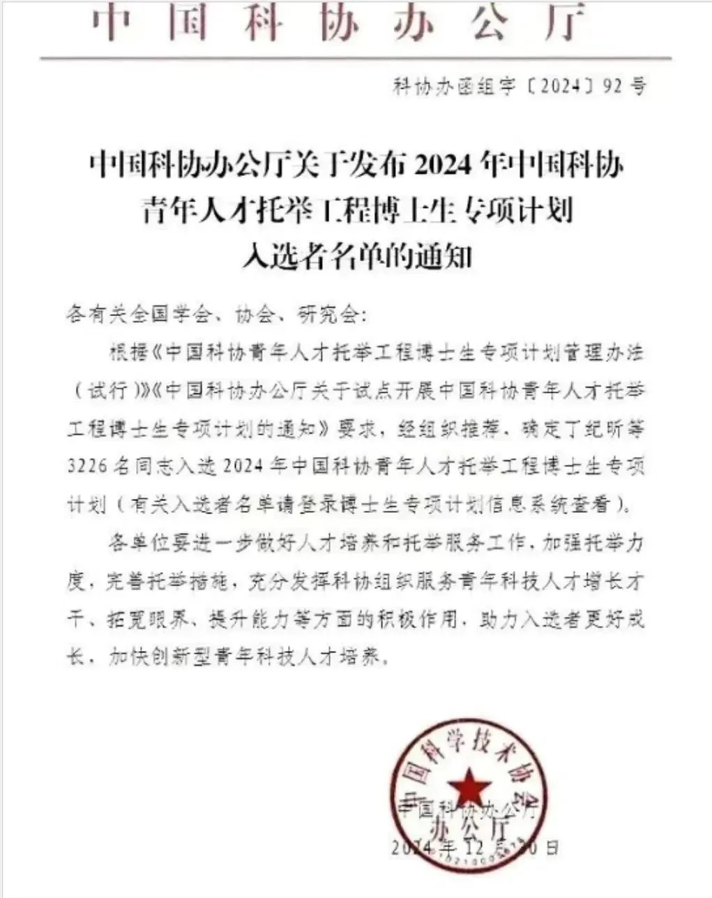 据悉,中国科协青年人才托举工程博士生专项计划于2024年首次试点设立,旨在让学术资源更广泛地惠及有发展潜力的青年科技后备军,以30周岁以下高年级在读博士研究生为支持对象,依托全国学会、协会、研究会进行托举培养,为入选者提供组织吸纳、学术兼职和学术资助等托举服务,助力优秀博士研究生更好成长,加快创新型青年科技人才培养,充分发挥科协组织服务青年科技人才增长才干、拓宽眼界、提升能力等方面的积极作用,通过组织吸纳、安排学术兼职、支持学术论文发表、提供学术交流平台、资助开展出国(境)访学等方式,助力优秀博士研究生更好成长。