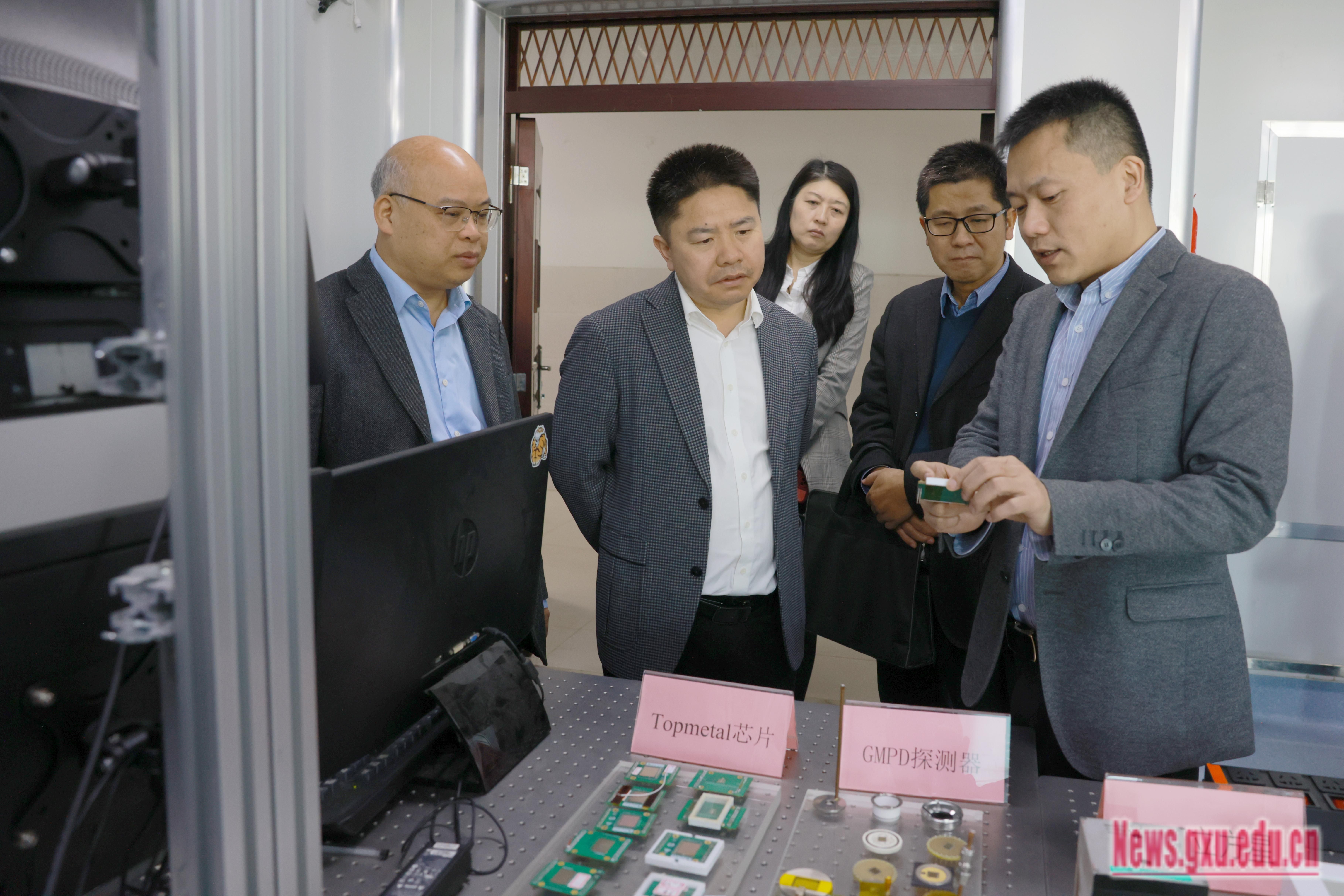 在广西天体物理及其相关技术重点实验室,黄琦详细考察学校天体物理和空间科学技术团队参与的中国空间站项目,以及牵头研制“HERD—高能宇宙辐射探测设施”和“POLA-2—伽马暴偏振探测器”的情况。