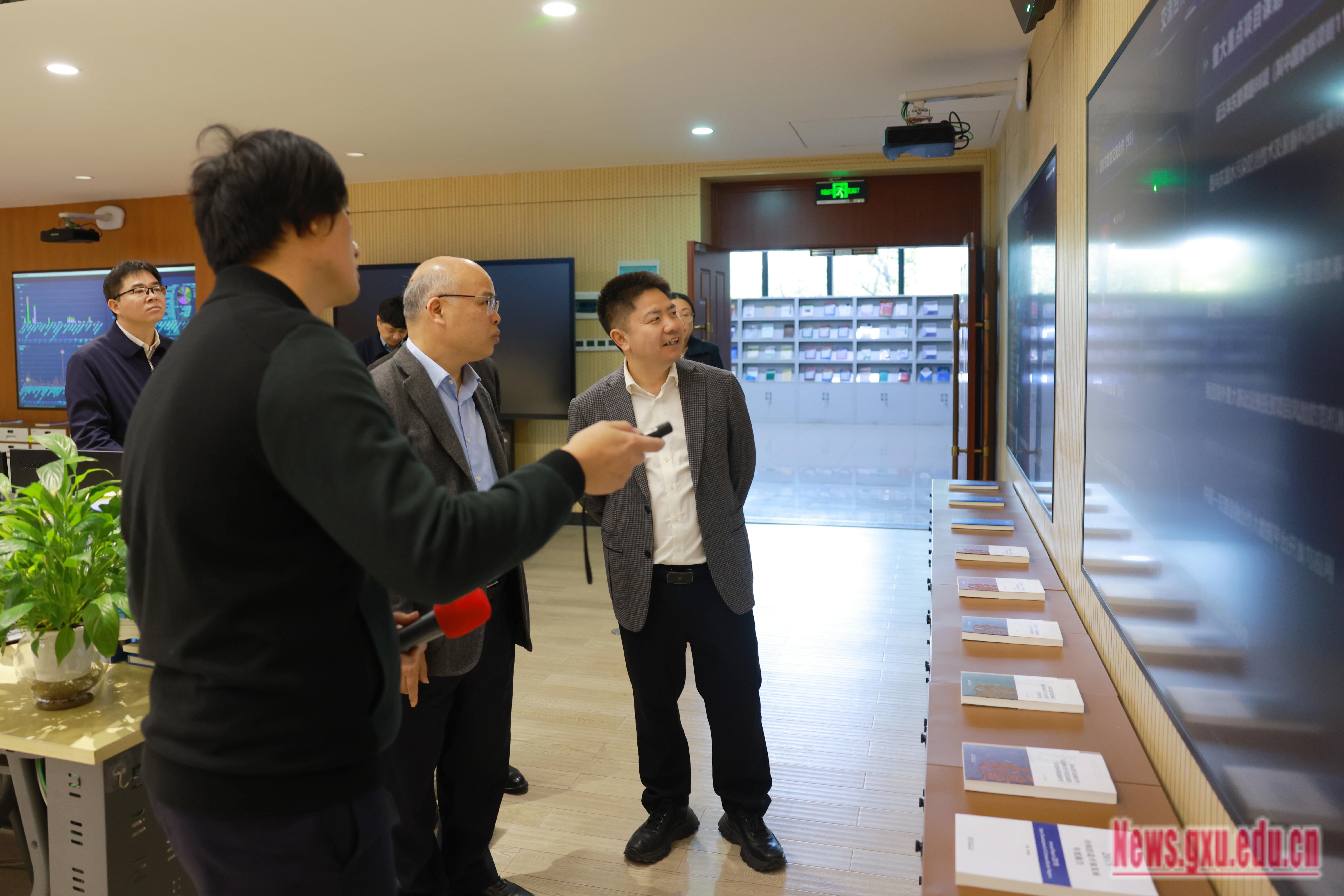 在中国—东盟信息港大数据研究院数据分析挖掘中心,黄琦听取了学校在聚焦区域国别智库、数字经济等研究领域工作进展的汇报,详细了解学校在汇聚东盟成员国顶尖学术机构、组建中国—东盟大学智库联盟、打造东盟区域国别研究数据资料中心、运用现代信息技术赋能区域国别等研究情况。