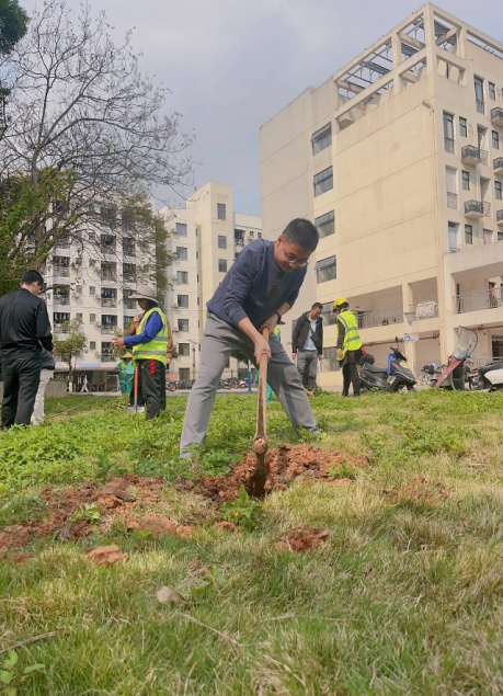 在专业技术人员指导下,参加植树党员及教职工默契合作、同心协力,抡镐挖坑、运送树苗、挥铲填土、提桶浇水,个个热情高涨、干劲十足,现场呈现出一片热火朝天的劳动景象。一株株新种下的红楠木、观叶木迎风挺立、错落有致,为美丽校园再添斑斓色彩。
